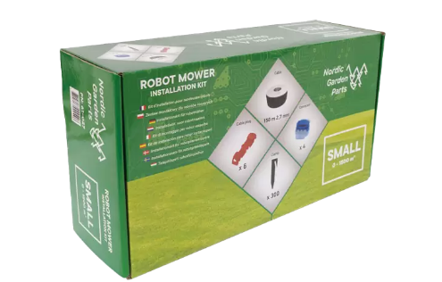 Installationskit, der inkluderer alt der skal bruges for at installere en robotplæneklipper i din have. Pakken indeholder 150m (Ø2,7mm) afgrænsningskabel, 300 jordspyd, 4 samlere og 4 kabelstik.