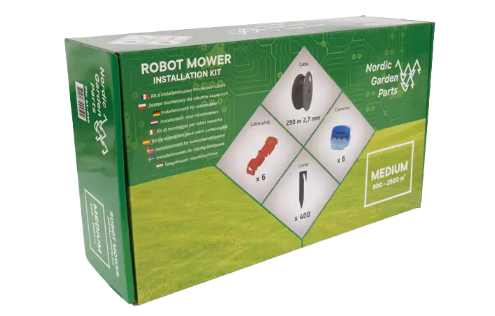 Installationskit, der inkluderer alt der skal bruges for at installere en robotplæneklipper i din have. Pakken indeholder 250m (Ø2,7mm) afgrænsningskabel, 300 jordspyd, 4 samlere og 4 kabelstik.